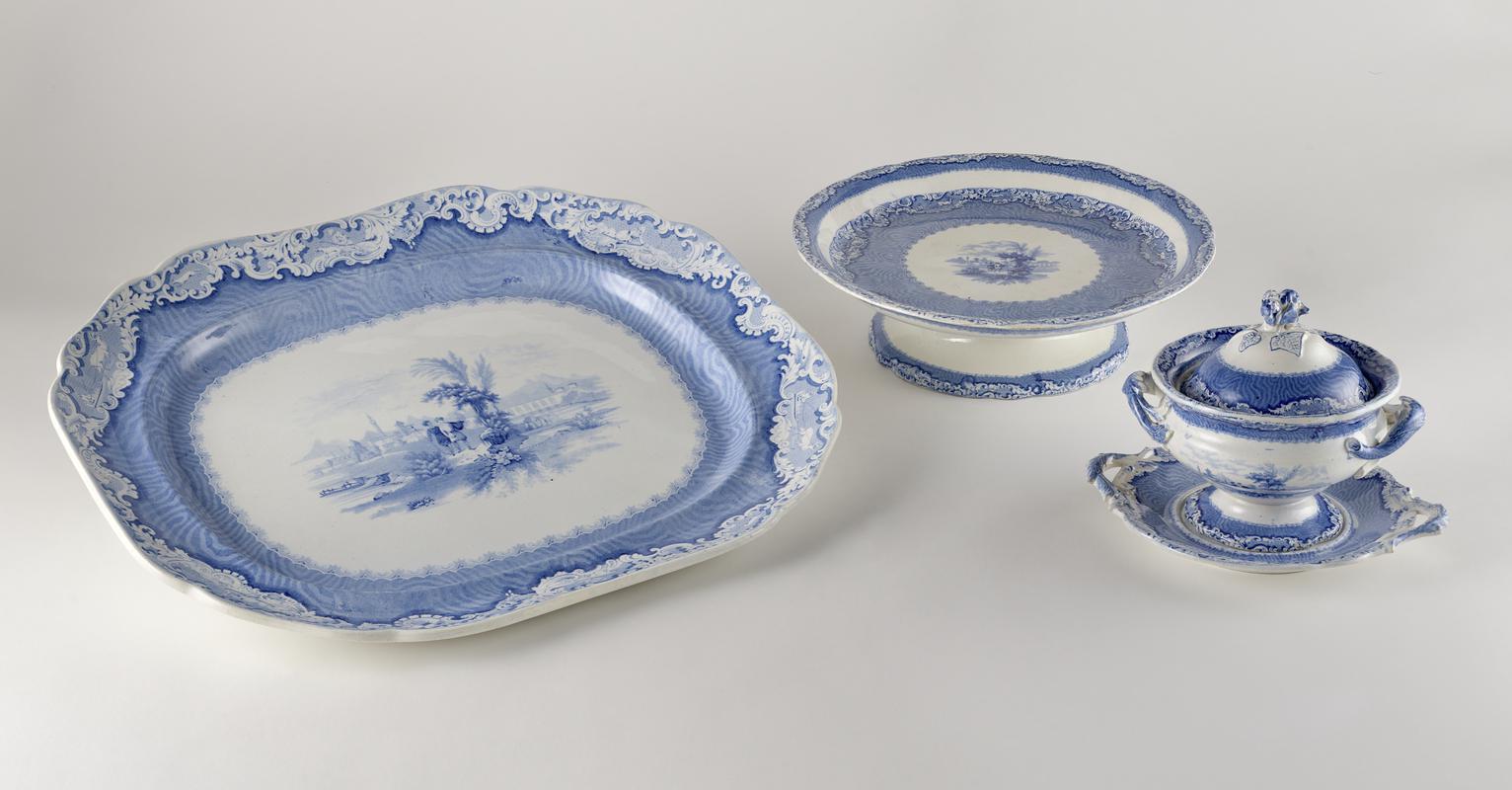 Stand, earthenware, round-ended oblong shape with flat base, curving sides and spreading rim, eight shallow notches and lobes to the rim; transfer-printed in blue with to the centre of the well the 'Willow' pattern, to one side of the scene three figures cross a bridge overlooked by a willow tree, beyond them is a boat on an expanse of water, to the other side is a pagoda surrounded by trees with a zigzag fence in the foreground, two birds fly over the scene, border to the well of alternating lattice-work and diaper panels, border to the rim of ornate scrolls, wheel shapes, Greek key shapes, and other geometric shapes on a blue scaled ground.