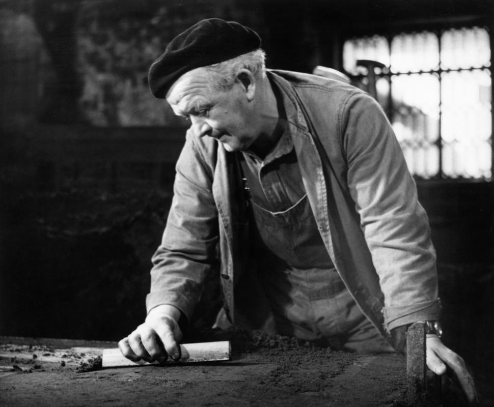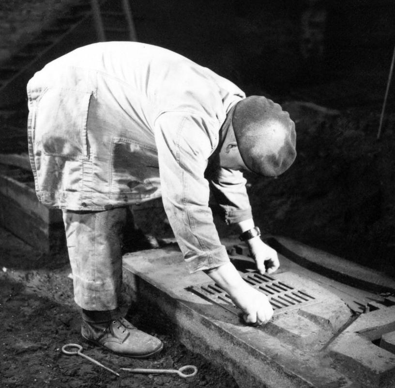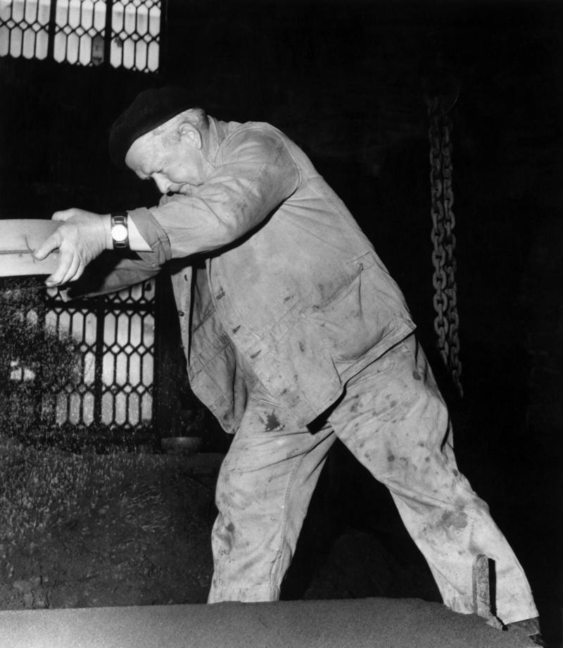 Workers at Dinorwic slate quarry. Frame 12 on contact sheet with 11 photographs (originally 12, one has been cut off) showing pattern making moulding at Dinorwic slate quarry.