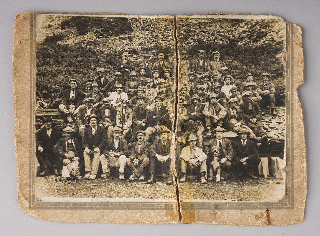 Photograph showing showing a group of ten quarrymen at Dinorwig Quarry. The quarrymen are stood in front of the rockface. Standing with the quarrymen is an unidentified woman, wearing a dress, hat, and holding an umbrella. It is believed she is visiting the quarry.
