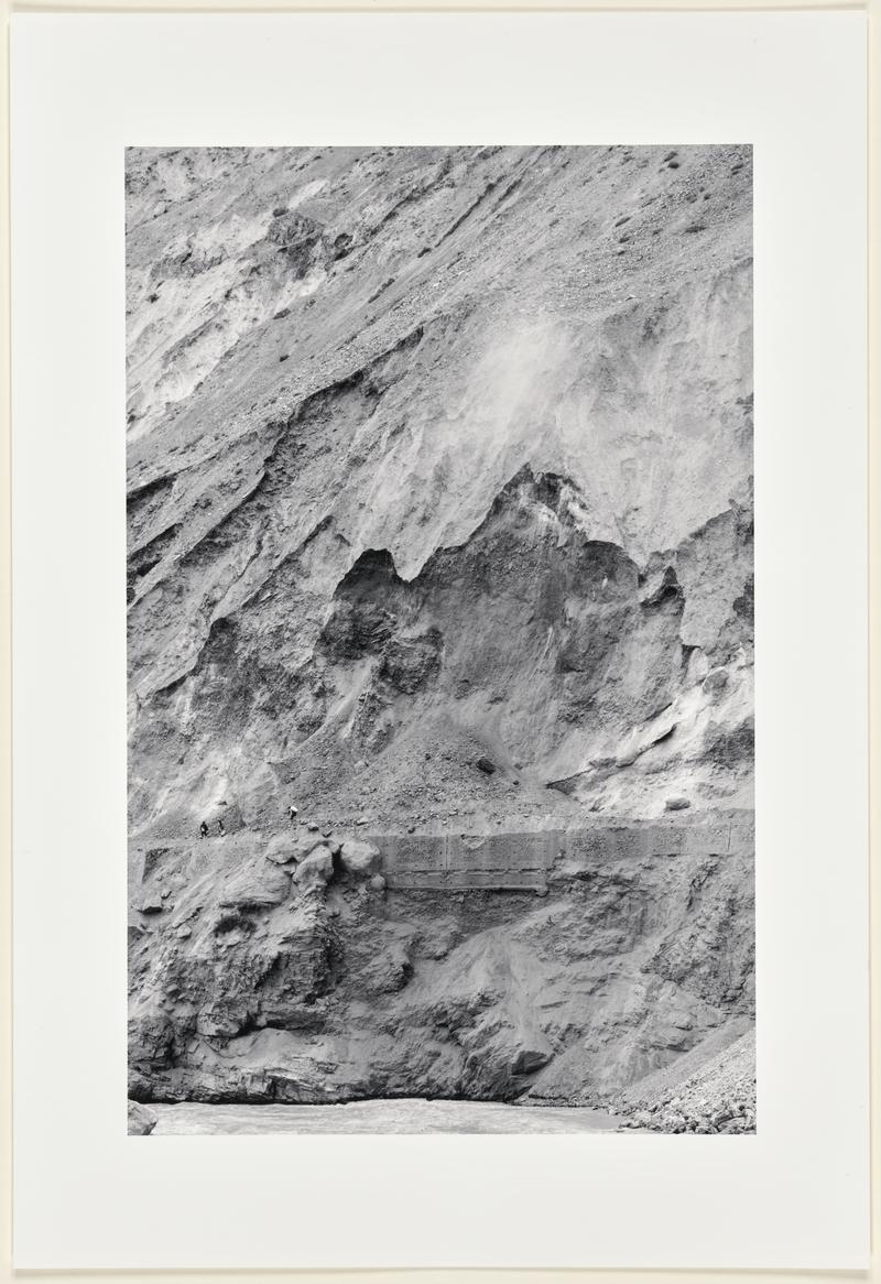 A Boarder Roads Organization (BRO) worker tries to cross a perilous recent landslide that blocked the road near Sumdo