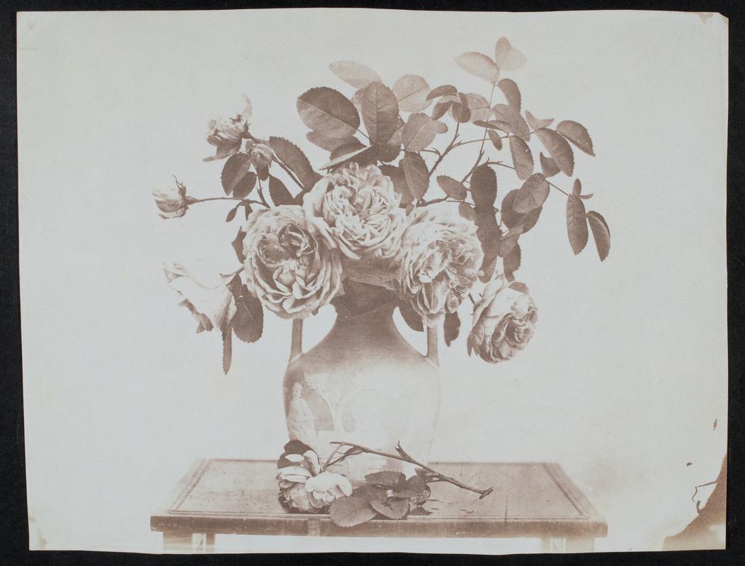 Collodion glass negative showing a Wedgewood style vase full of "rosa ruga", with one on the table the vase is standing on.