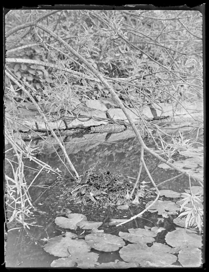 A Little Grebe (Tachybaptus ruficollis) nest with eggs (covered). Photographed 6 July, 1908.