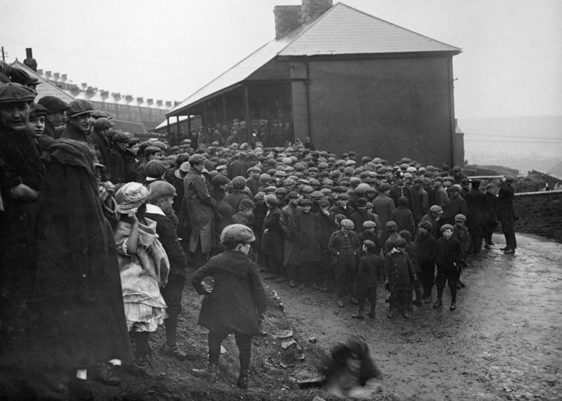 Men outside the boiler stack at Cambrian Colliery, Clydach Vale. Most of them are boiler workers maintaining steam for the colliery.