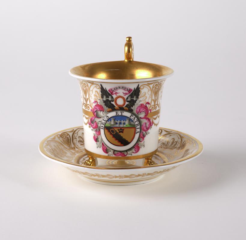 Cabinet cup and saucer of soft-paste porcelain, the cup standing on a rounded incised foot rim, with straight sides flaring to end in an everted lip rim; handle looped high above the lip rim with upper and lower terminals in the form of serpents heads with central spur in the form of a tail; the saucer, standing on a straight sided foot rim with rounded spreading sides; the cup painted with a selection of wild and garden flowers, including pink garden roses, a purple and yellow tulip, a red hollyhock, wild strawberries and forget-me-nots, the interior of the lip rim with a geometric border of dark green triangles interspersed with gilded triangles with circle and line motif with gilt scroll and dot pattern beneath, gilt band to foot rim and lip rim and foliate gilding to handle; the saucer painted with a selection of wild and garden flowers including pink garden roses, buttercups, vetch, a red poppy and honeysuckle, broad gilt band to rim.