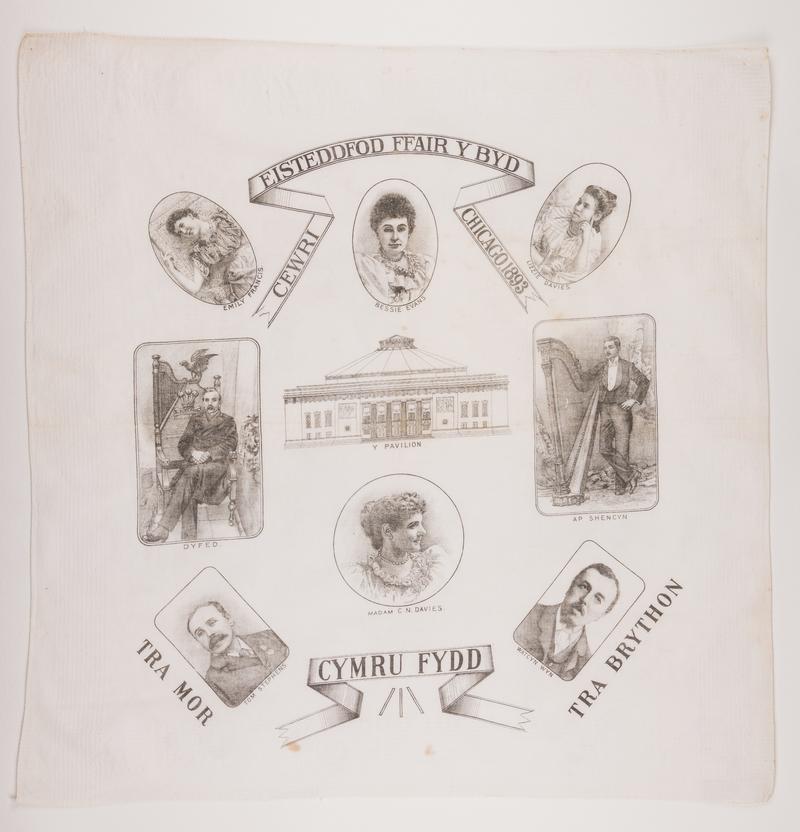 White cotton handkerchief produced as an advertisement for Jones & Co of Pontypridd and to commemorate the 1893 National Eisteddfod, Pontypridd. Central image depicts the cremation of Dr William Price.