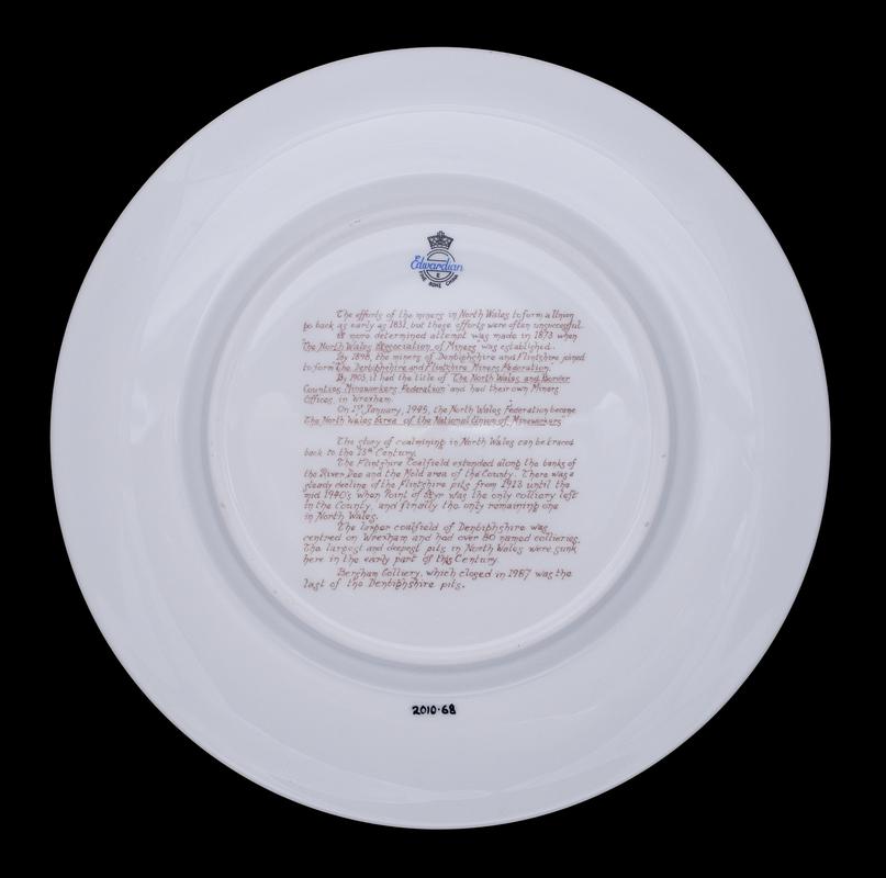Circular plate with N.U.M. logo at centre. Various badges printed around rim of plate. Inscription on reverse giving important dates in the history of the N.U.M. between 1841 and 1985.