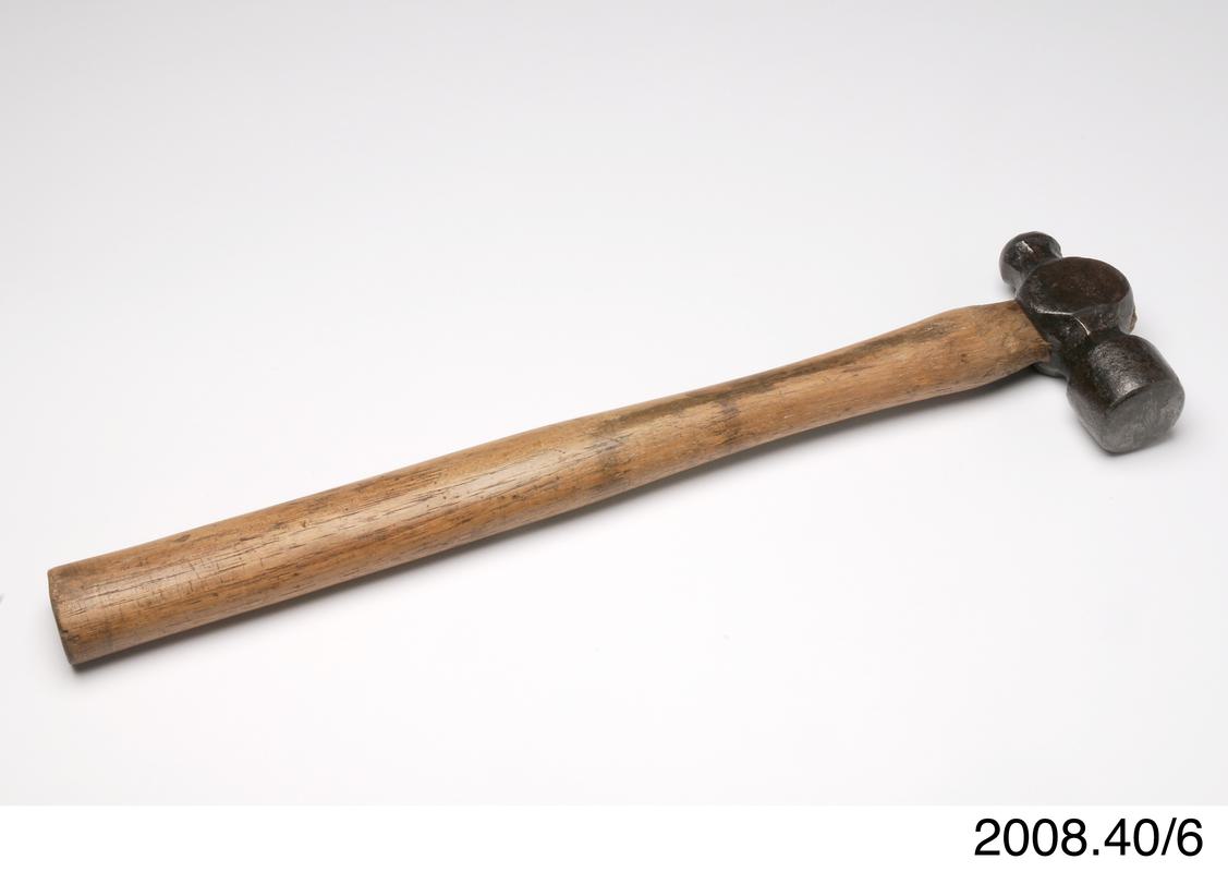 Ball pein hammer. Metal head with wooden handle. Originally held in canvas kit bag (2009.22/1) with collection of splicing tools (2009.22/2-15).