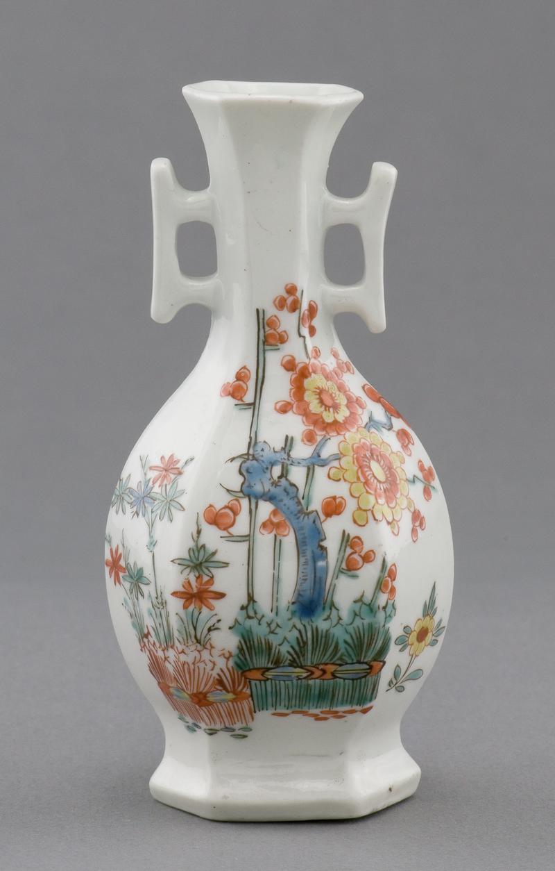 Coffee cup, hard-paste porcelain, bucket-shape, flat base, c-scroll handle; decorated with a salmon pink ground with pebble gilding reserved with a view of Wiseton Hall in Nottinghamshire surrounded by a thick gilt line border, the inside rim is decorated with a gilt bead border, the edge, base and handle are gilded.