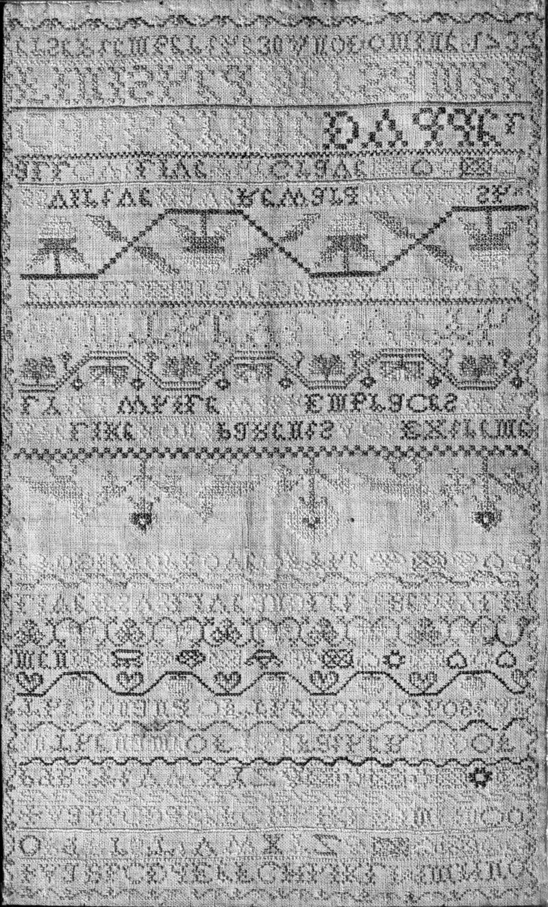Pink and white patchwork quilt, made to commemorate the centenary of the English Baptist Chapel in Pontypridd in 1910. Five panels of white and pink thread embroidery. Central panel with inscription 'Baptist Centenary Pontypridd 1910' embroidered in stem and chain stitch. Top right panel shows the chapel in 1810. Top left panel shows the chapel as rebuilt in 1883. Bottom left shows rocking stones of Pontypridd. Bottom right shows two bridges of Pontypridd, first built in 1750, the second in 1798. Members paid 6d to have their signatures embroidered on the small pieces of pink material sewn together. Motifs of flowers and leaks between the signatures.