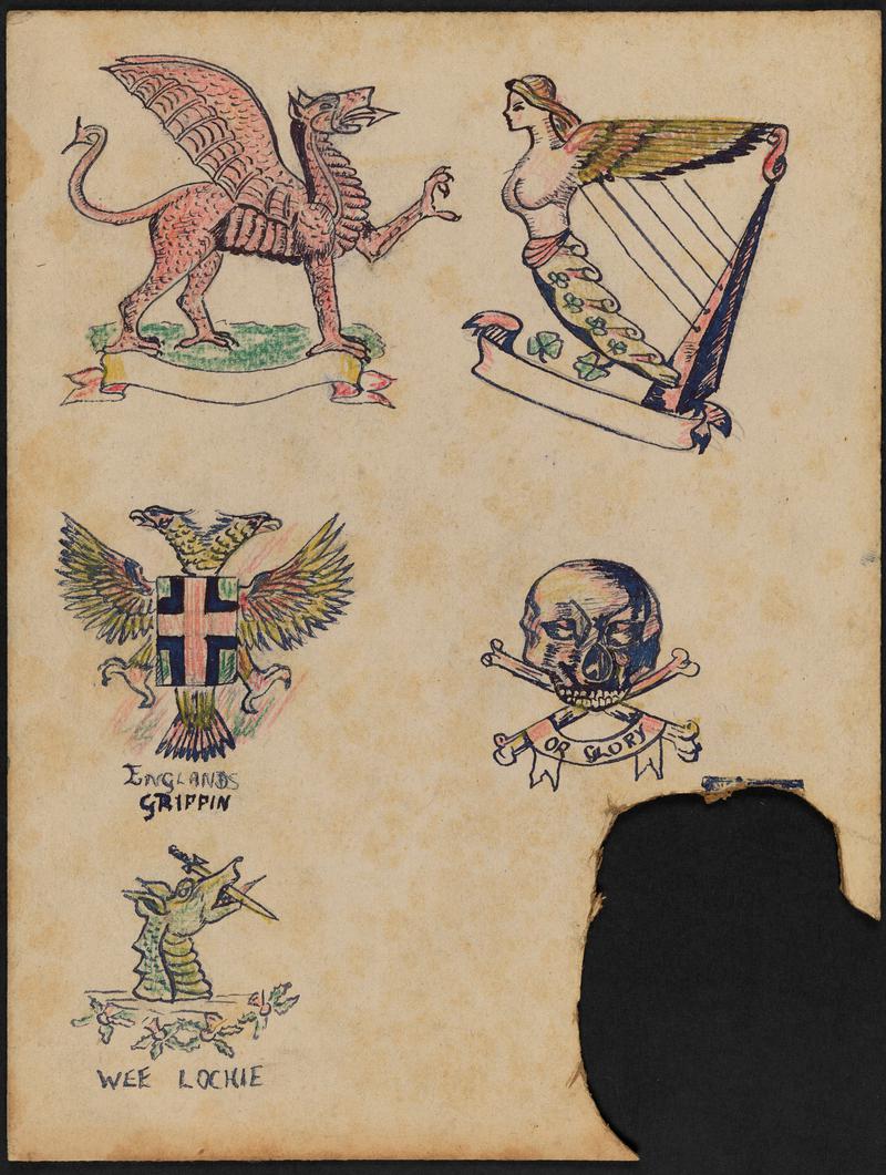 Sheet of lined paper with three coloured images of tropical birds cut out and stuck on. From a collection formerly belonging to tattoo artist Jessie Knight