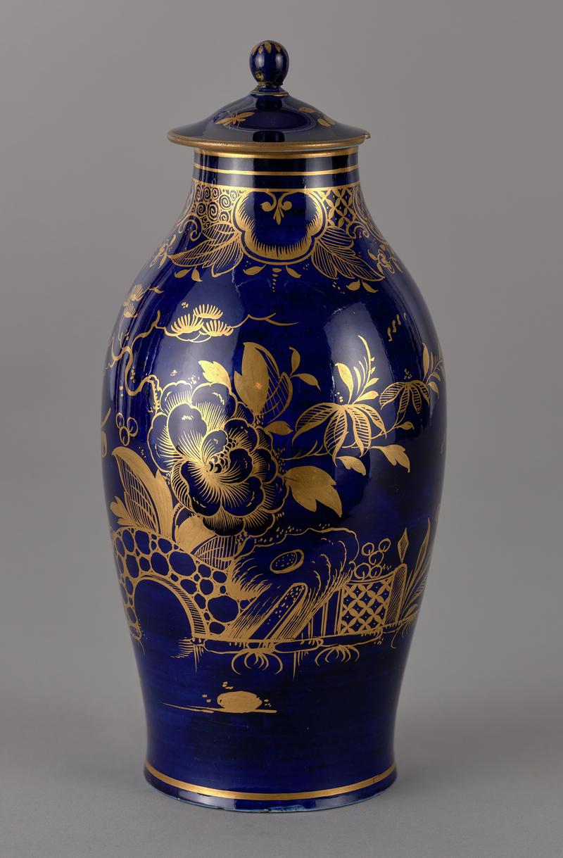Vase, earthenware, standing on a square base, urn-shaped body with spreading short pedestal foot and cylindrical neck, to either side of the neck twin ring and scroll handles resting on moulded masks at the lower terminals, high domed cover with a nipple shaped finial to the top of the cover; the vase covered with an underglaze blue ground at the foot, the middle of the body, the neck, the handles and the cover, and a yellow ground at the lower body and the shoulder, the shoulder painted in sepia and white with a pattern of foliage, flower heads and arabesques, the base painted black. The foliage of the cover chipped.