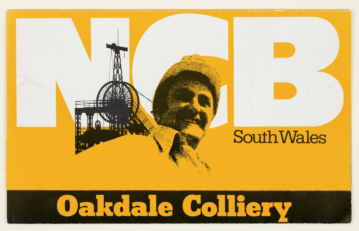 Black & yellow print on both sides of thick paper. One side shows the head of a miner, and the other has a photograph of Oakdale Colliery with statistics printed below.