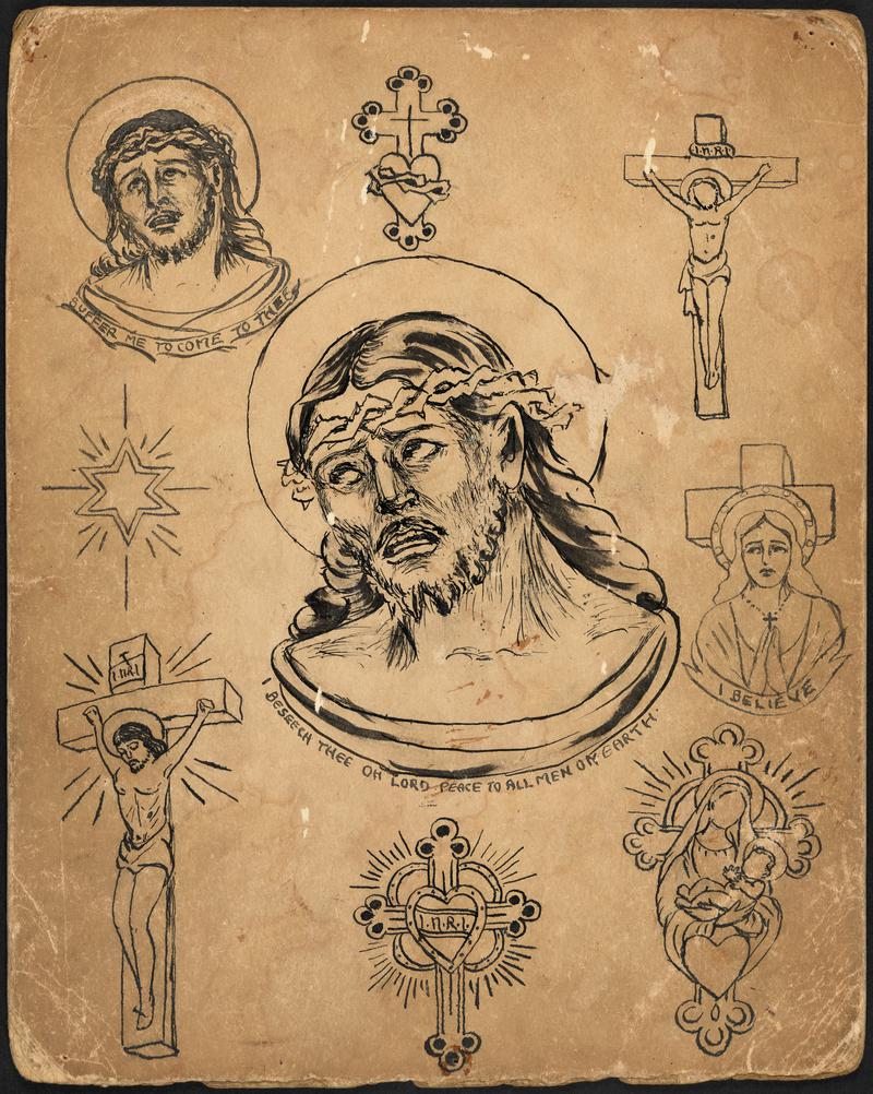 Two sided tattoo flash on card. Two colour images on one side, including a flag.