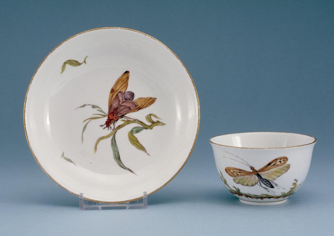 Jug, hard-paste porcelain, standing on a foot rim, pear-shaped body, scroll handle, folded spout; decorated in polychrome enamels on eitherside with a spray of flowers, one with a pink rose in the centre, border to green ground with black lines and scroll gilt outline around rim, gilt highlighting to handle, gilt border to foot rim.