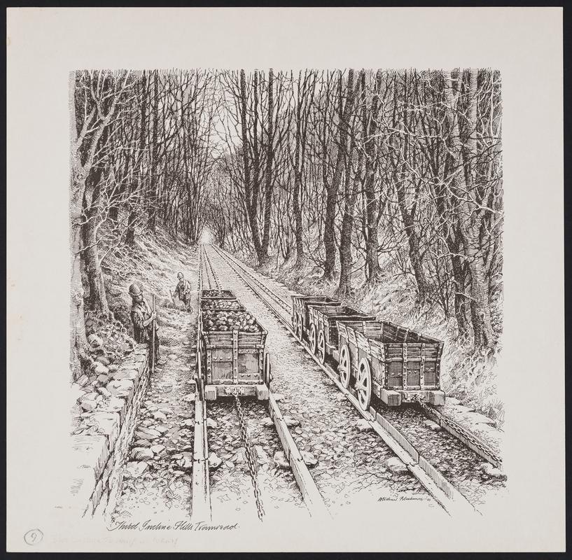 Black and white print showing horse-drawn trams at the head of Cwm Llanwenarth making a return journey to Blaenavon Ironworks. Artists signature and date '84' printed bottom right.