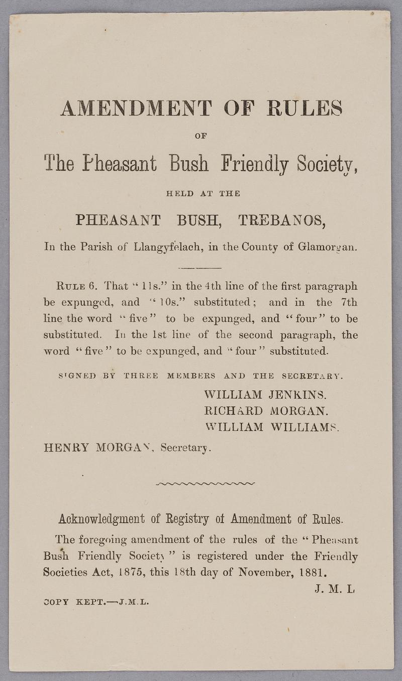Declaration of good health by an adult joining Pheasant Bush [Tinplate Works] Friendly Society, Pontardawe, 1 November 1912. Printed on blue paper with handwritten details in ink.