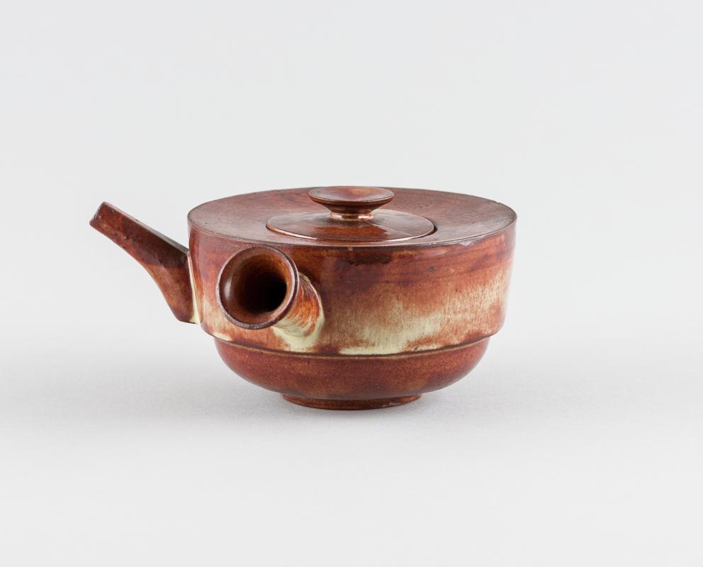 Pot (vase), cream-coloured earthenware, a modified cylinder folded over at the rim to form a tear-shaped opening; trailed and sgraffito slip decoration in brown and black.