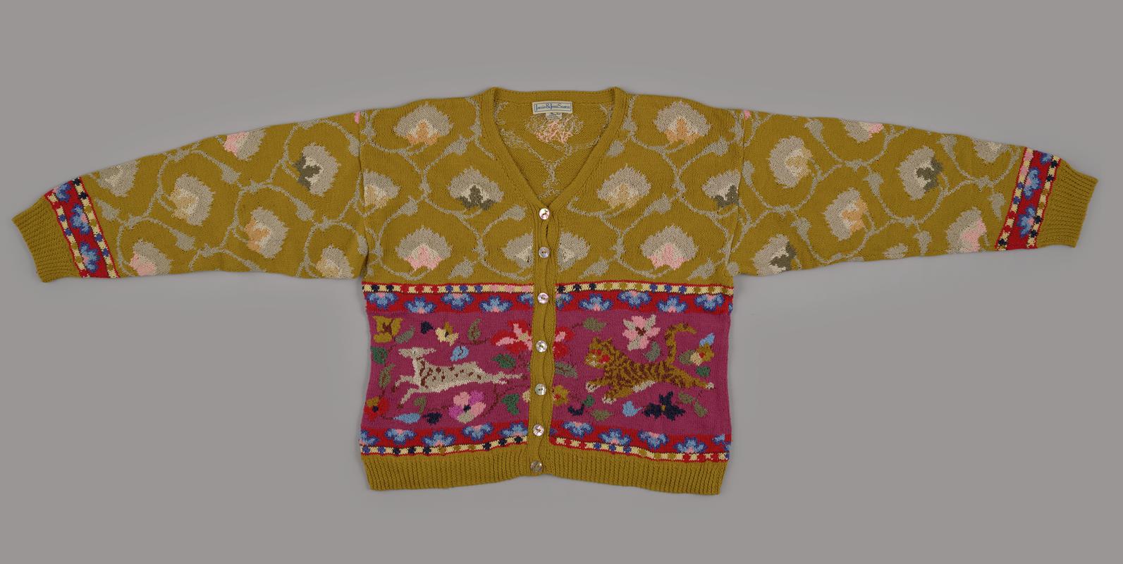 Large loose-fitting multi-coloured cardigan from the first hand-knitted collection of Jamie & Jessi Seaton (later renamed J&J Seaton). Pockets inserted into side seams, shawl collar, four mother-of-pearl button fastening, some metallic-effect and chenille yarns used for certain elements of the design.