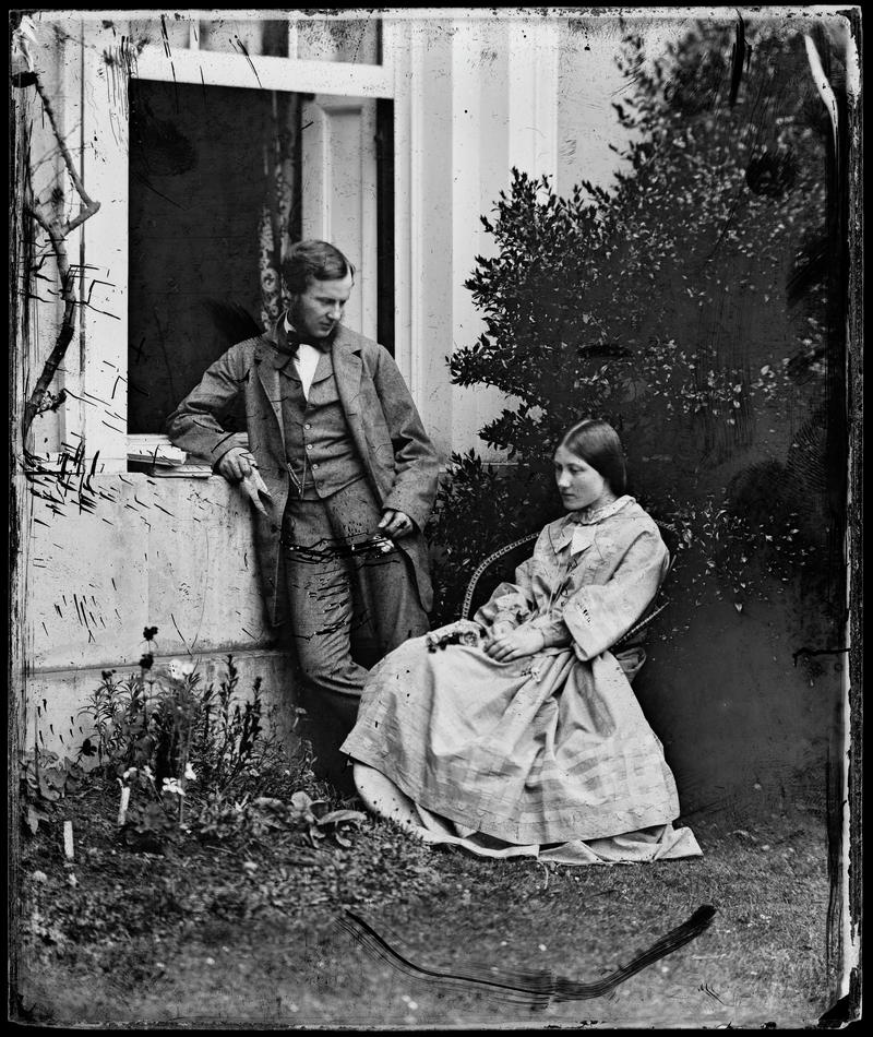Stereo negative showing Thereza (nee Llewelyn) and Nevil Story Maskelyne in the garden.