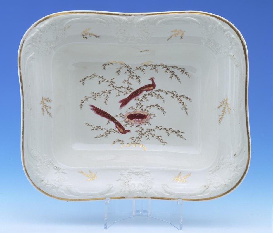 Plate, buff coloured earthenware, circular shape with small inset base, curving sides and spreading rim; covered all over with a blue tinged tin-glaze, the upperside of the plate painted in blue with to the centre of the well a male figure clad in eighteenth century costume and seated in a chair, smoking a long-stemmed pipe, a Chinese-style border to the rim of foliate motifs on a deep blue ground issuing narrow scrolling lines which spread down the sides of the well, a brown edge to the rim, the underside of the plate decorated with blue dashes and circles.