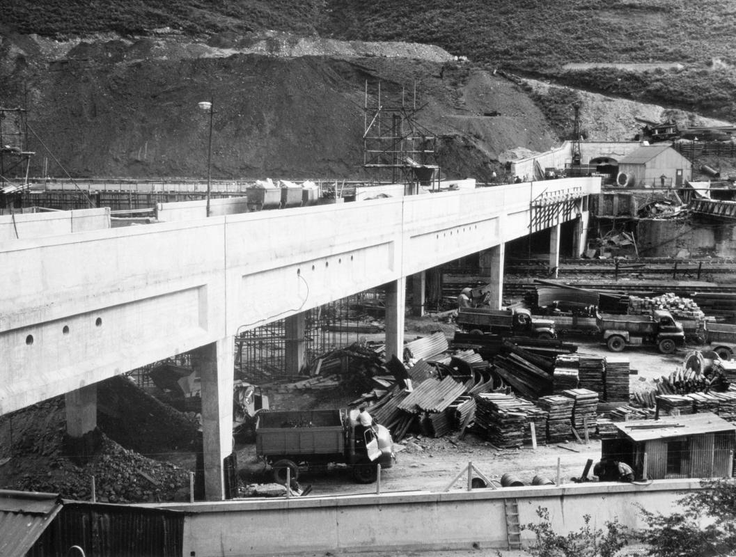 Black and white photograph showing the double-decker reinforced concrete bridge for conveyors and trams spanning the valley. No. 4 drift portal in the background. Taken during the construction of the new drift mine at Hafodyrynys, 1957.