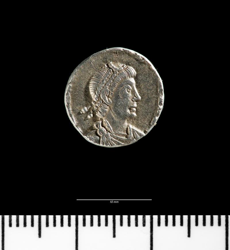 This coin is part of Roman coin hoard containing fourteen silver siliquae minted between AD 360 and 402. The last coin was struck in the name of Arcadius in the mint at Milan under the emperor Honorius between AD 397 and AD 402.