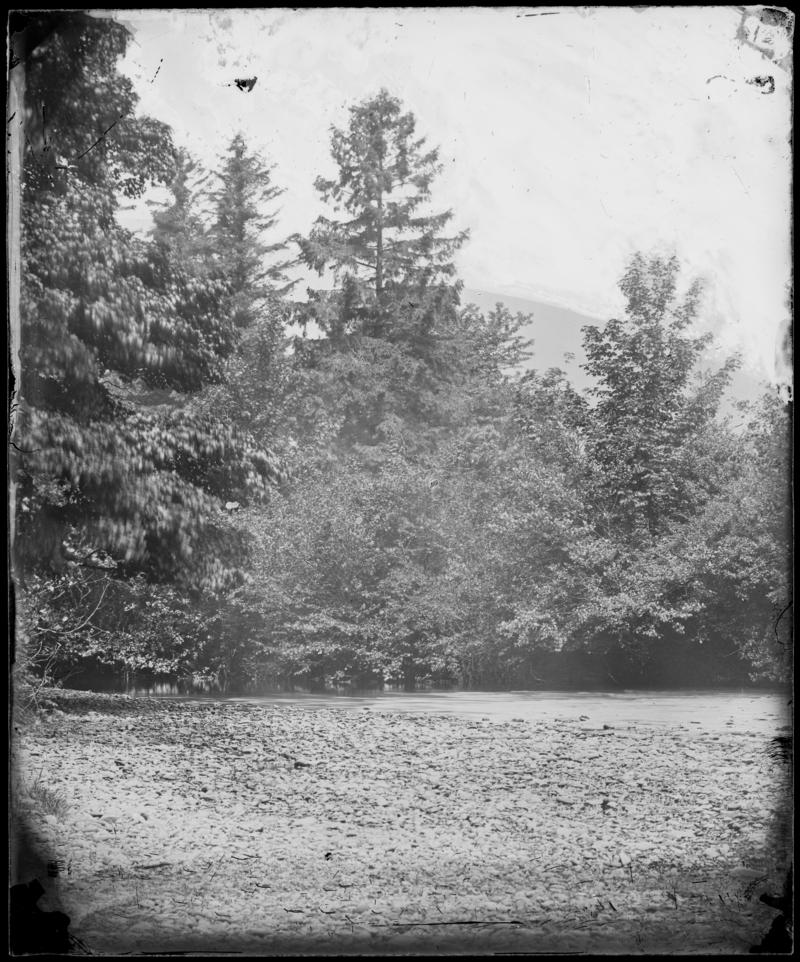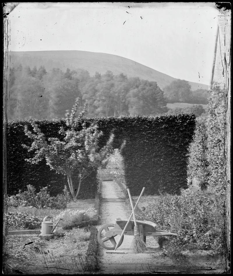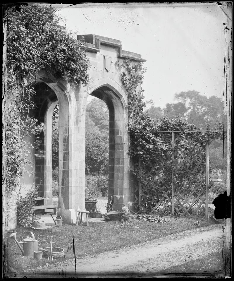 Collodion glass negative. Exterior of Lanelay house with a female figure standing in doorway. Part of sky has been overpainted black.