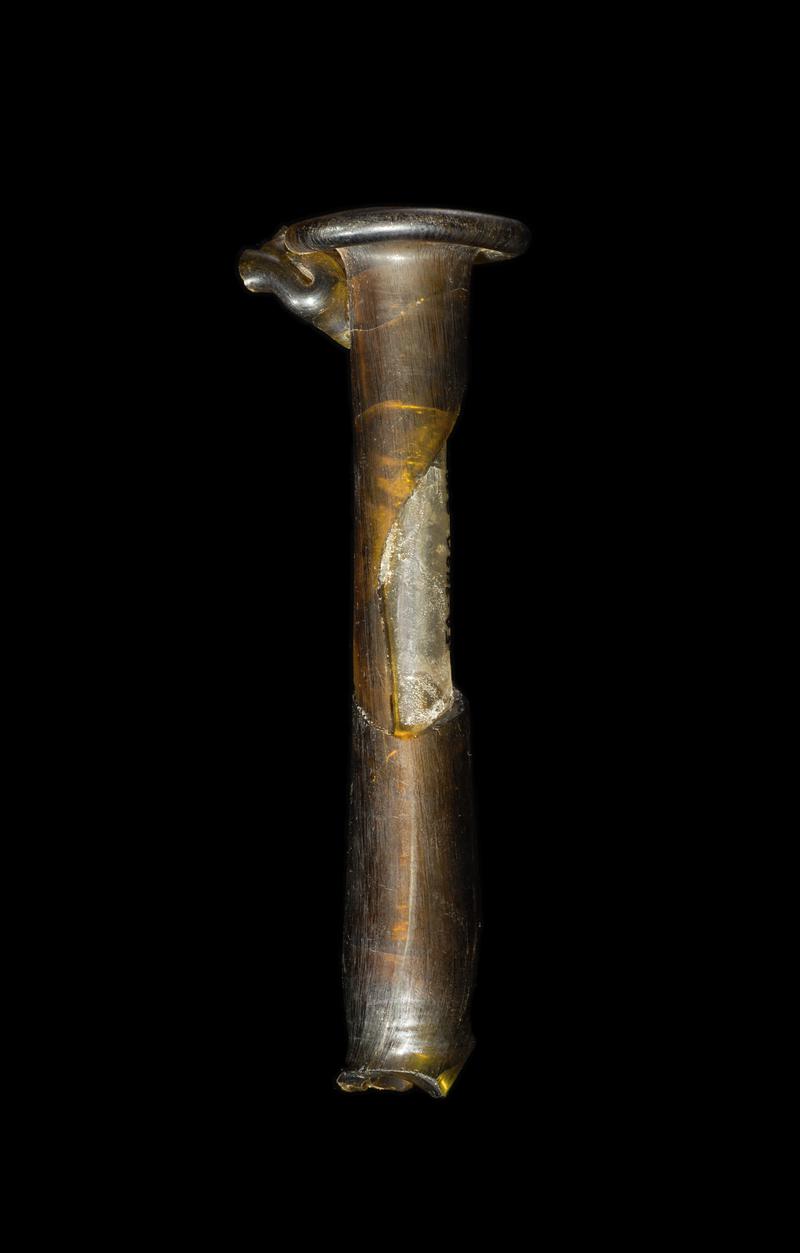flask containing lead shot, made of horn wiht screw on horn lid; wooden base; stopper missing