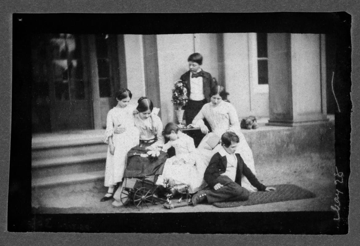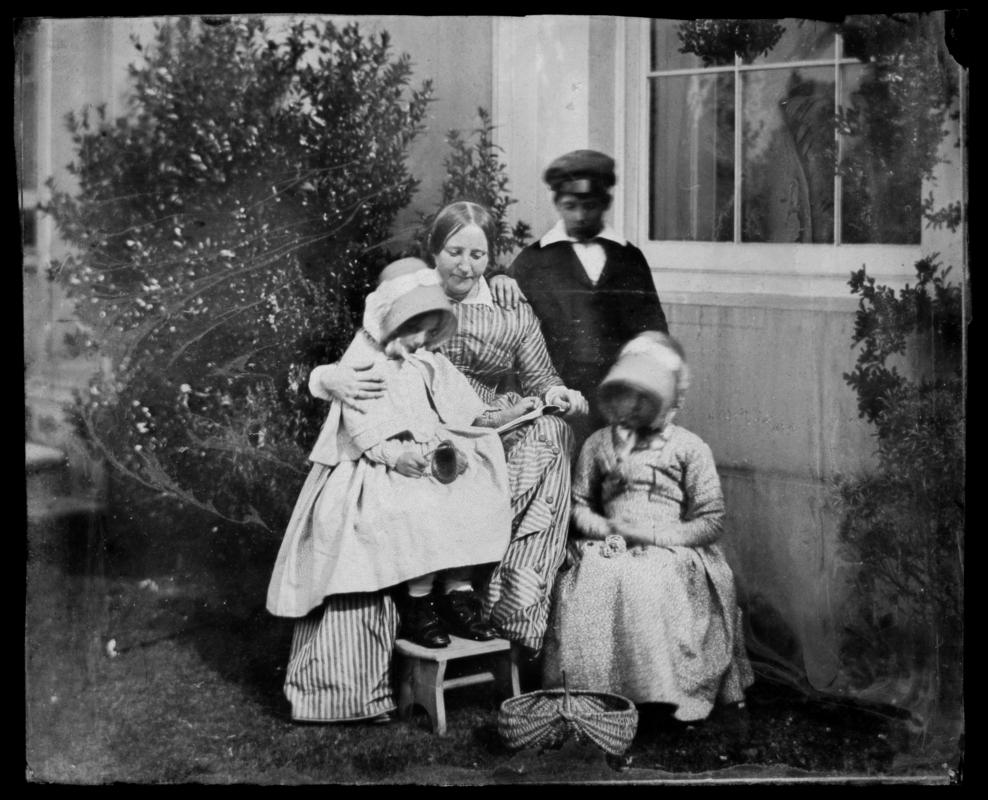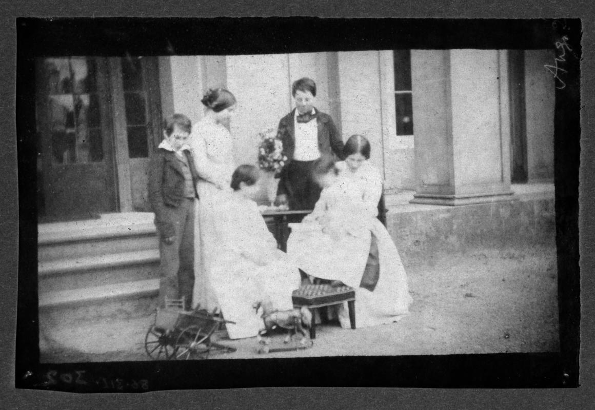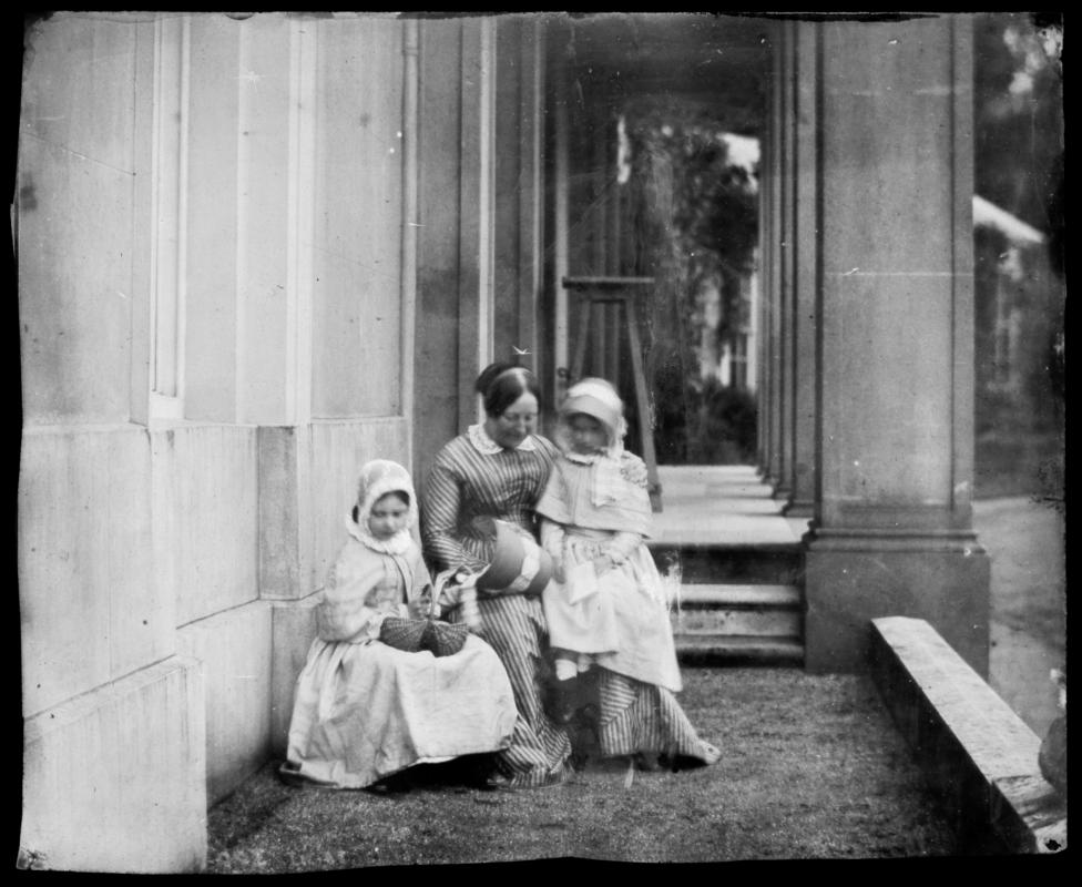 Calotype negative of Llewelyn family showing Mrs Emma Llewelyn seated with Elinor, John Talbot standing behind them, and Thereza sat to the side. Taken at Penllergare.