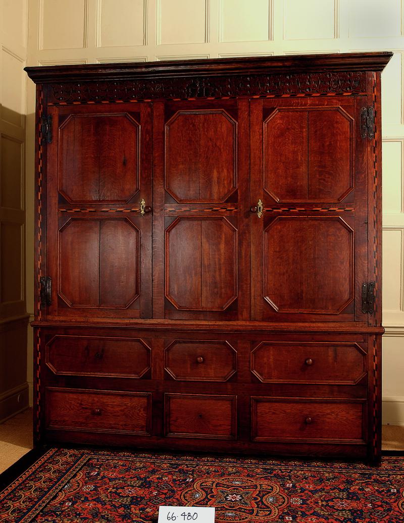 A linen cupboard in two portions; the upper portion is enclosed by two doors and has two shelves; the lower is similarily constructed; a plain early 19th century piece.