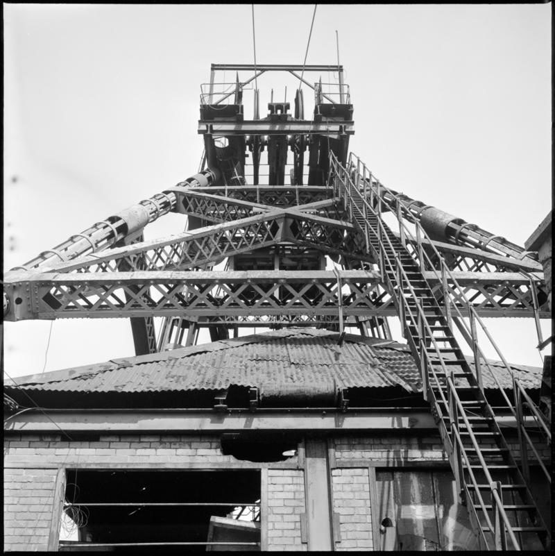 Negatif ffilm du a gwyn yn dangos y pen y pwll yng Nglofa Ffaldau.