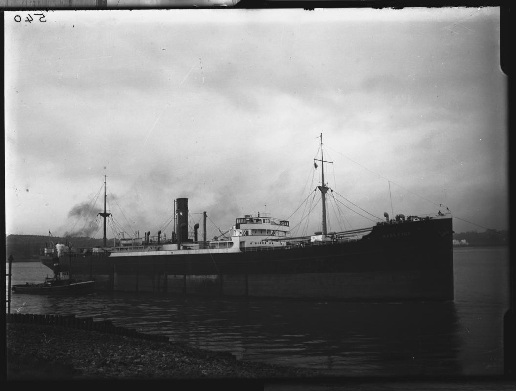 ¾ Starboard bow view of S.S. FRANKENWALD and tug MARGARET HAM at Queen Alexandra Dock, Cardiff, c.1936.