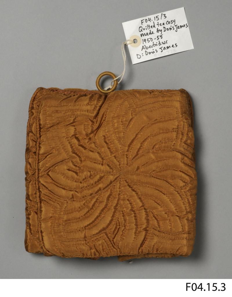 Quilted pale pink satin nightdress case, early 1950s. Made by Doris James (1923-2015), a hairdresser from Abertridwr.