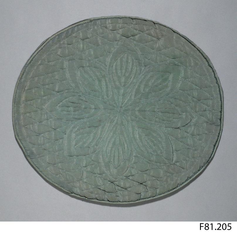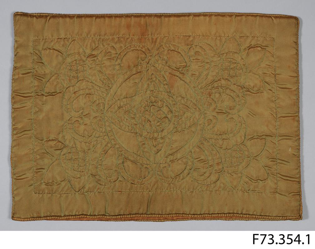 Rectangular, envelope-style. Thinly padded. Made from one continuous piece. Quilting uses pink stitching thread. Central scallop on edge of flap. Flap is quilted with sycamore leaf motif and spiral filling. Single trellis on pouch, back and front. Lined with pale apricot coloured satin. Side edges and edges of flap have pink piping, while edge of inside opening has piping of same fabric as lining.
