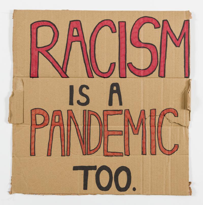 Brown cardboard, double-sided and bound with black tape on all four sides. Slogans hand-drawn in black ink. One side inscribed with a quotation from Martin Luther King: "INJUSTICE ANYWHERE / IS A THREAT TO JUSTICE / EVERYWHERE" MLK. Reverse inscribed: BLACK LIVES MATTER.