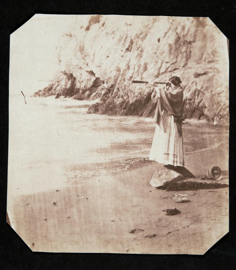 Collodion glass negative of Thereza Llewelyn with birds in a cage on a table.