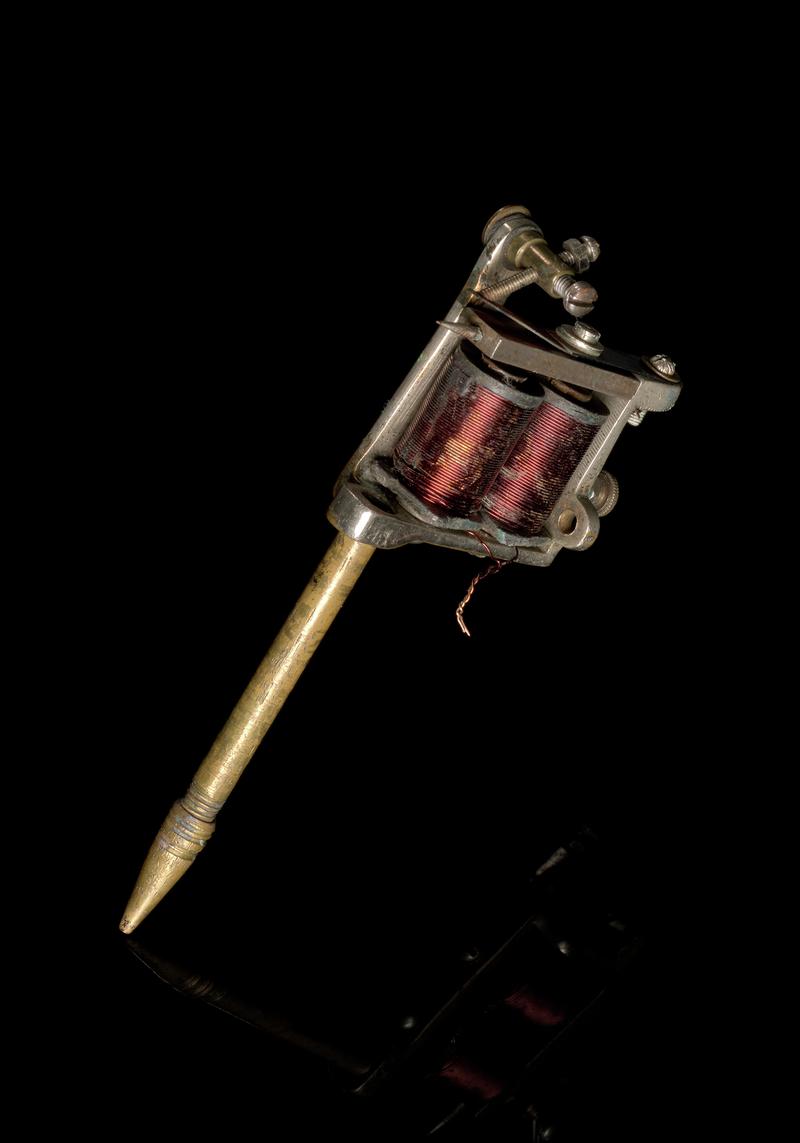 Stained pine frame comprising two single-grooved uprights fitted into plain base on two short feet. Upper horizontal bar slightly curved on both sides, locks around uprights to to hold complete stack of quills in place.