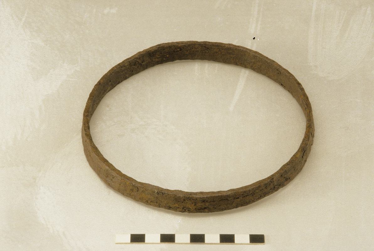 Nodiadau: Found during the construction of an airfield at RAF Station Valley. Some certainly, the rest probably, from a wet meadow which formed the margin of Llyn Cerrig Bach. The exact depth below the grassy surface at which the objects were deposited is not known. The bog was excavated to a maximum depth of 20 feet. A few objects were found on the spot, after the peaty deposit had been won from the boggy margin of the lake. The rest, with the exception of 44.32/58, were found on that portion of the adjacent aerodrome on which the peat from this site had been spread. Animal bones were associated with the deposit and many metal objects were stained with vivianite.