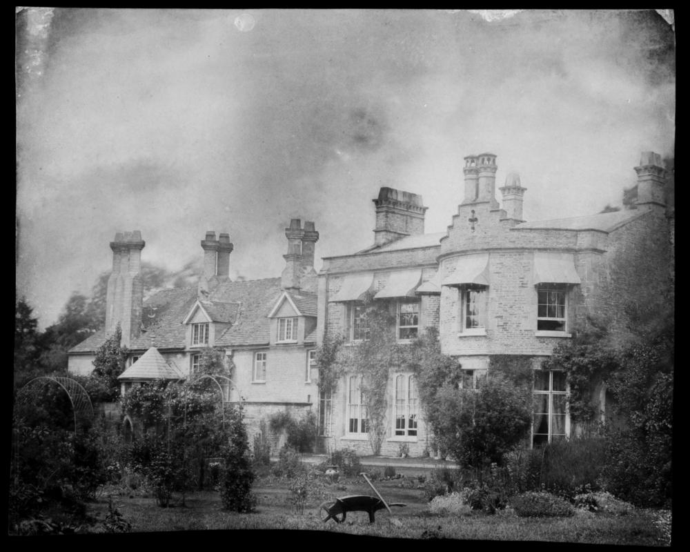 Salted paper print. View of the rear of Lanelay Hall, near Llantrisant, with gardening tools in foreground.