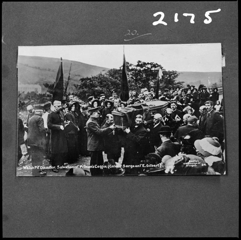 Black and white film negative of a photograph showing a funeral procession passing through Senghenydd. Caption on photograph reads 'Welsh Pit Disaster. The Salvation Army Pitman's funeral passing through Senghenydd'.