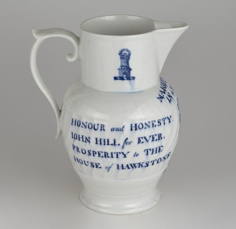 Jug, porcelain, inset base, ovoid body with cabbage-leaf moulding, cylindrical neck with vertical moulded ribs and a moulded band of pointed leaf and dotted motifs below the rim, mask-head spout; underglaze blue transfer-printed decoration, the 'Pleasure Boat' ('Fisherman') pattern repeated three times around the body and once in two parts on the neck, a Chinese-style diaper-cell and dagger border pattern inside the rim.