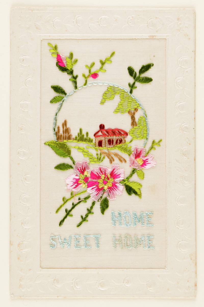 Cerdyn post pen-blwydd wedi'i frodio a anfonwyd gan W. Clifford Morgan o Gaerdydd at ei chwaer. Neges mewn llawysgrifen ar y cefn: 'Wishing you many Happy Returns for the Day / Your Loving Brother Cliff'. Ym mis Tachwedd 1914, roedd yn gwasanaethu gyda 4ydd Bataliwn Ysgolion Bonedd y Ffiwsilwyr Brenhinol.