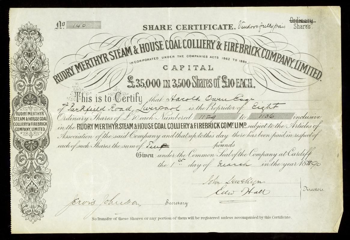 Rudry Merthyr Steam & House Coal Colliery & Firebrick Co Ltd., share cert