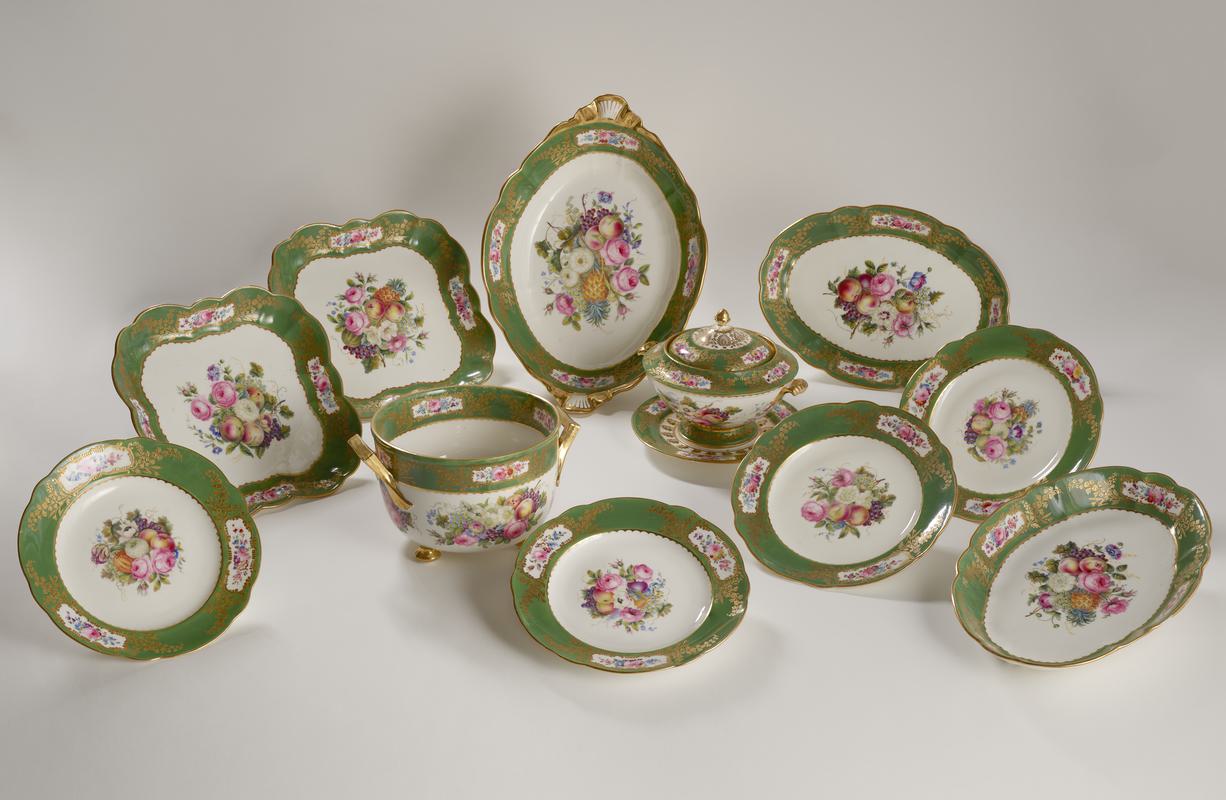 Cream tureen, cover, and stand, soft-paste porcelain; tureen standing on a shallow pedestal foot, slightly curved lower part, octagonally faceted, with straight tapered sides above moulded with c-scrolls and ribbon-tied flowers and foliage, slightly concave collar; two small loop handles, ribbed and slightly scalloped edge; flattened dome cover, moulded with c-scrolls and ribbon-tied flowers and foliage, and a pinecone finial; stand set on a tapered foot rim curving into slightly curved spreading sides, lobed lip moulded with c-scrolls and ribbon-tied flowers and foliage, groove moulded cavetto and a recess to accommodate the tureen; tureen painted with two large and six small flower sprays, and a garland of flowers around the collar; four small sprays on the cover, and six on the stand; blue and gilt notched lines, gilt bands to the foot rim, collar and rims; gilt detail to the handles and finial.