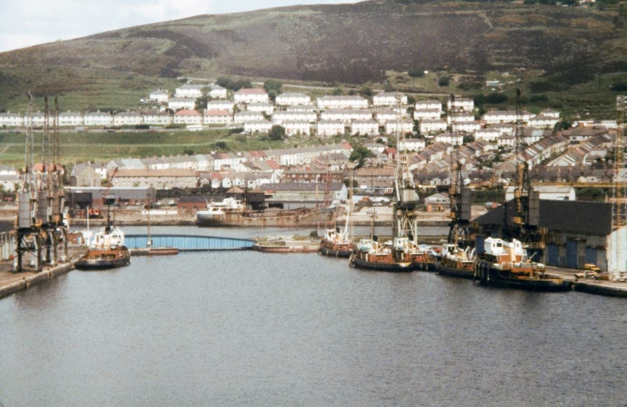 Remains of floating iron lock gate at Briton Ferry Dock, 1985. The photograph is looking north from the south side of the entrance into the partly infilled inner dock. The southern approach viaduct of the A48 Neath River Crossing is visible in the background. The dock including its single floating gate was built to the design of Isambard Kingdom Brunel.