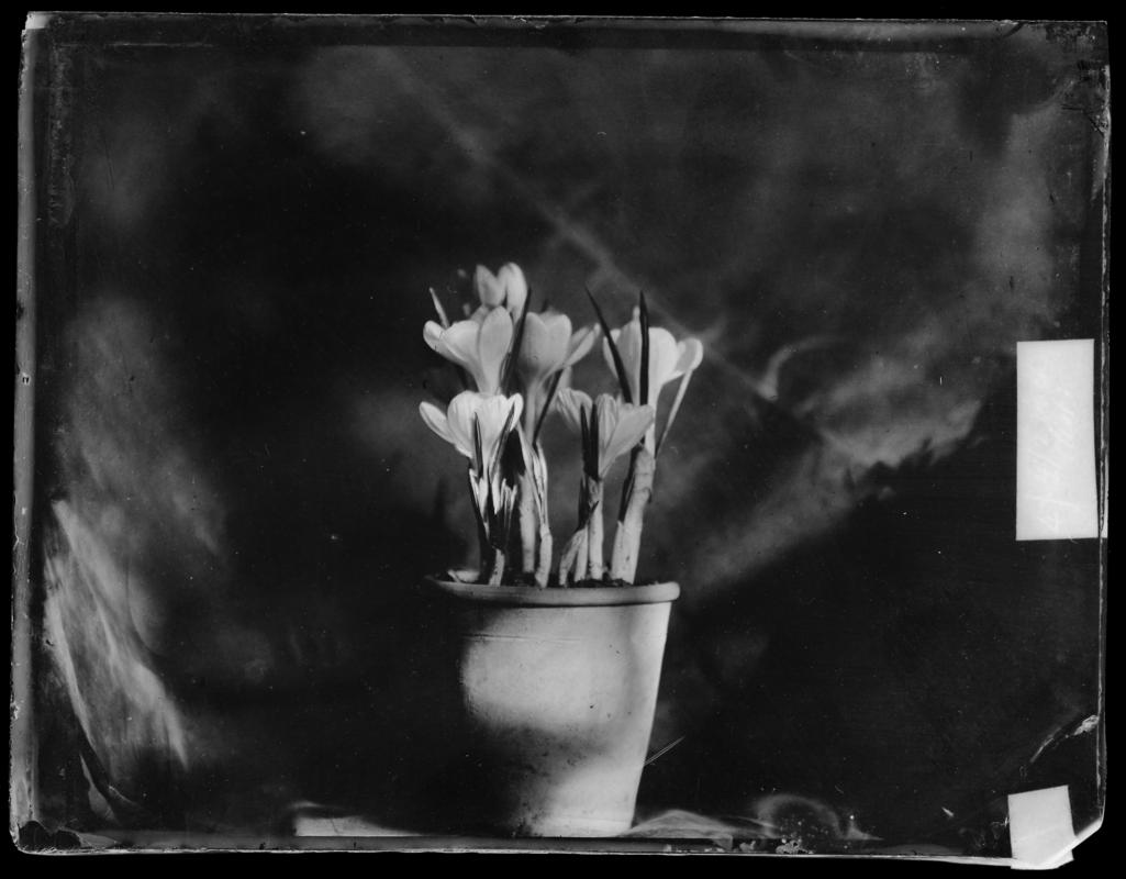 Collodion glass negative showing a vase of crocuses.