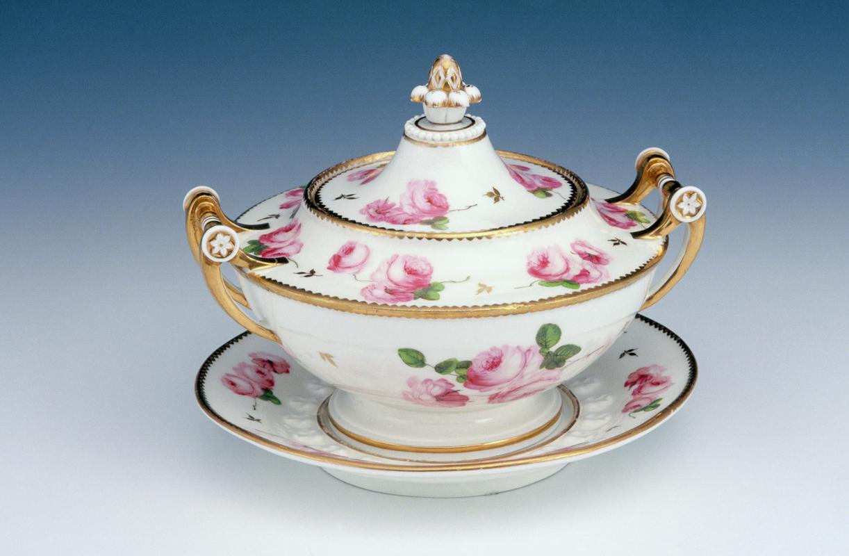 Circular stand, with ogee curved sides, and foot rim; centre with circular ridge, gilt. Gilt rim. Border of a wreath and garden flowers, including iris, convolulus and roses, in polychrome enamel; a pale blue rose with birds painted in the centre.