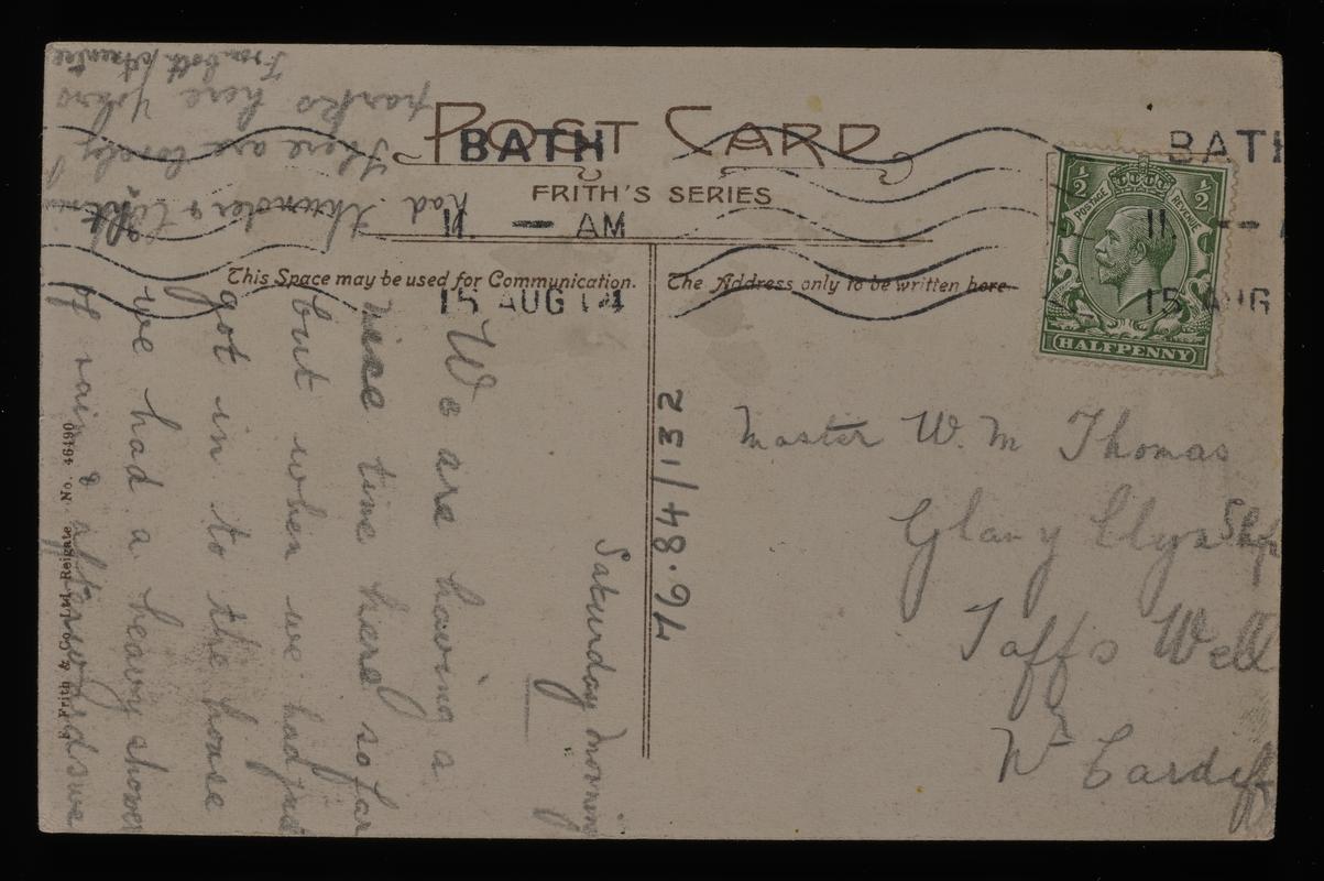 Black and white postcard of "Bergues - La Beffroi (XIV.siècle)". Sent to Mr T.M. Jones of Rhyl. Postmarked.