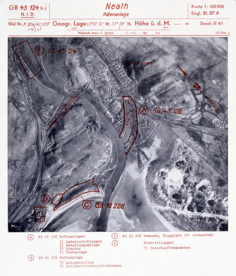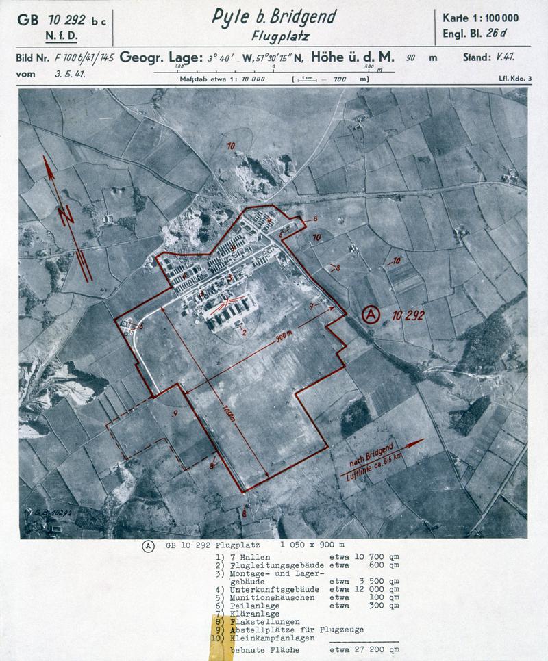 Photograph copied on white paper with details in German. Details outlined in red. Numbered 'GB 10 351 bc'.
