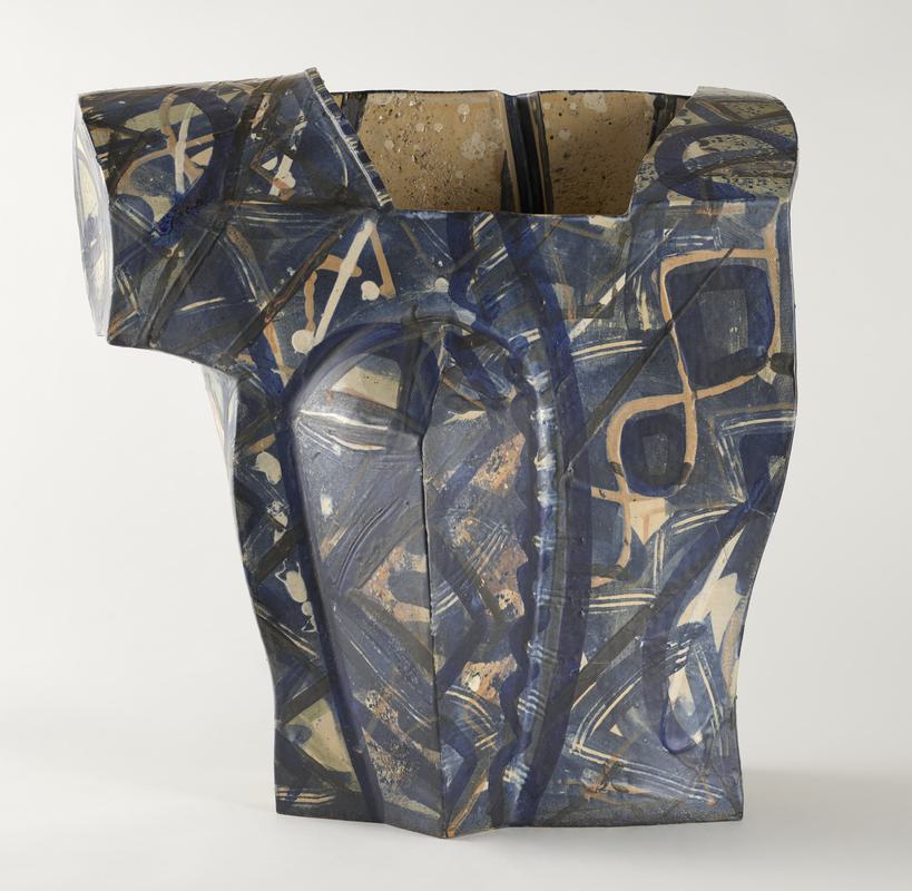Pot, earthenware, irregular multi-faceted form with triangular base section; painted in black and green, slip-trailed in relief with squiggles and dots, some black splashes inside.